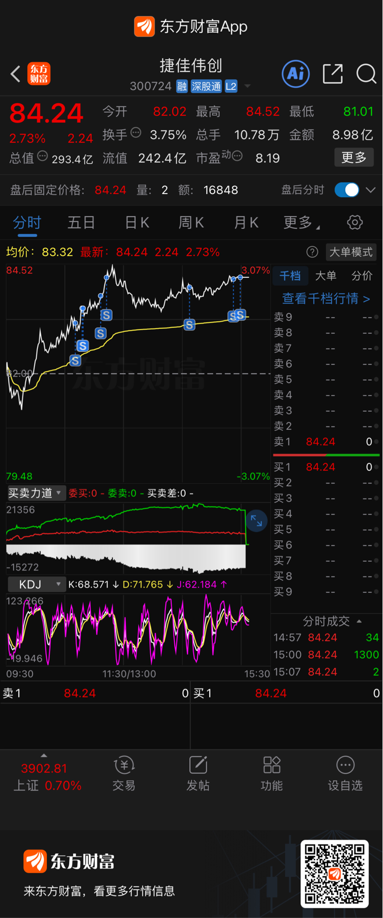 $捷佳伟创(SZ300724)$ 咱们主力逛贴吧么,今天跑了几千股,下周一直涨争取让我买不进来啊,最近一个多月T的胜率100%,让我追高吧加油