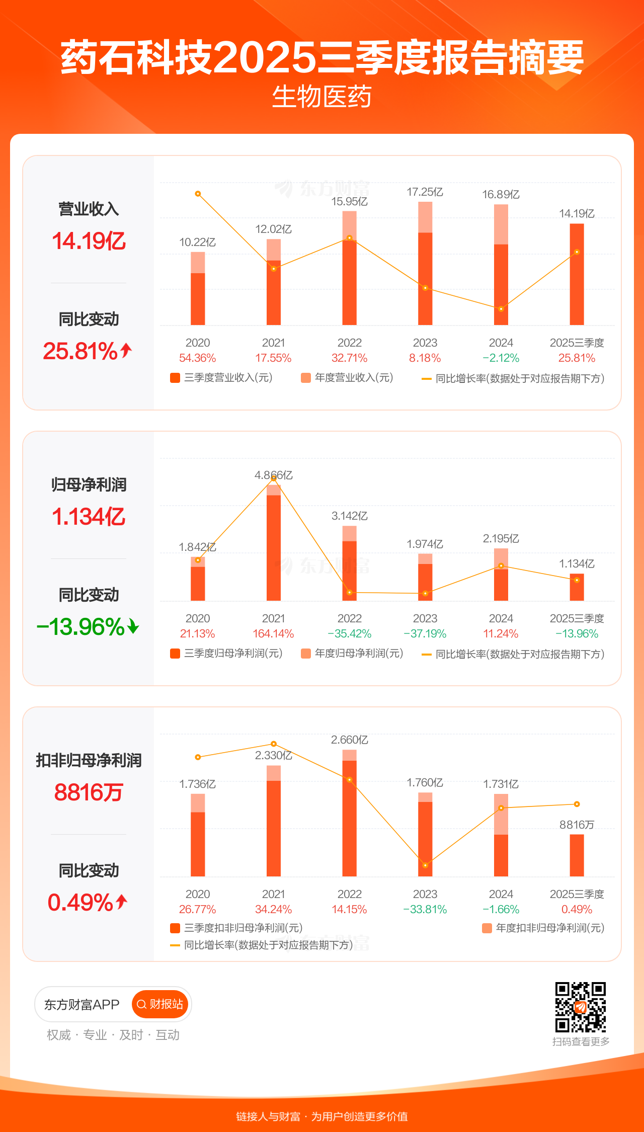 药石科技10月30日发布2025年三季报显示,公司前三季实现营业收入14.19亿元,同比增长25.81%;归母净利润1.13亿元,同比下滑13.96%;扣非归母净利润8815.73万元,同比增长0.49%。