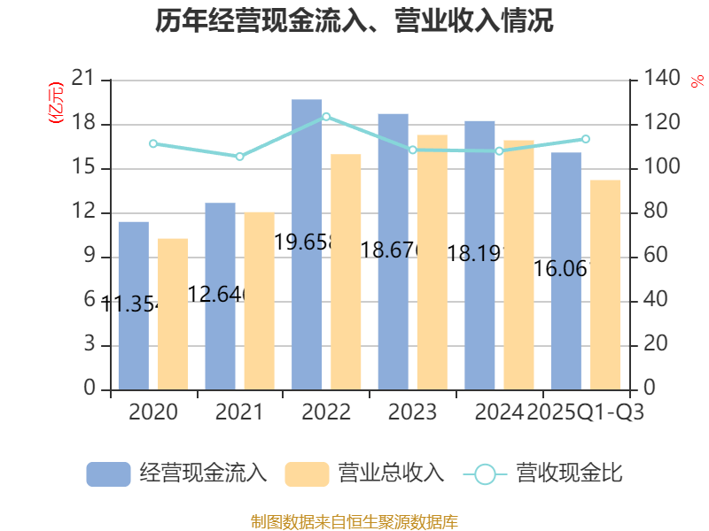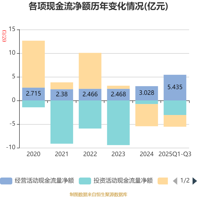 2025年前三季度,公司经营活动现金流净额为5.43亿元,同比增长187.74%;筹资活动现金流净额-2.47亿元,同比增加1.3亿元;投资活动现金流净额-3.08亿元,上年同期为-598.67万元。