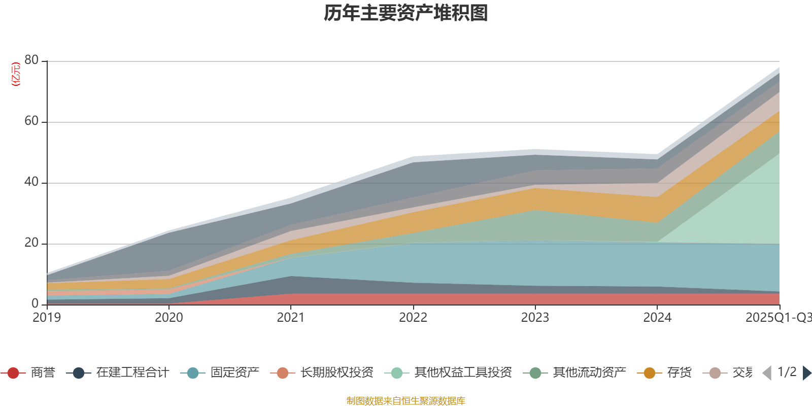 资产重大变化方面,截至2025年三季度末,公司其他权益工具投资较上年末增加18749.24%,占公司总资产比重上升37.83个百分点;固定资产较上年末增加7.54%,占公司总资产比重下降9.36个百分点;存货较上年末减少19.85%,占公司总资产比重下降8.38个百分点;应收票据及应收账款较上年末减少28.33%,占公司总资产比重下降5.33个百分点。