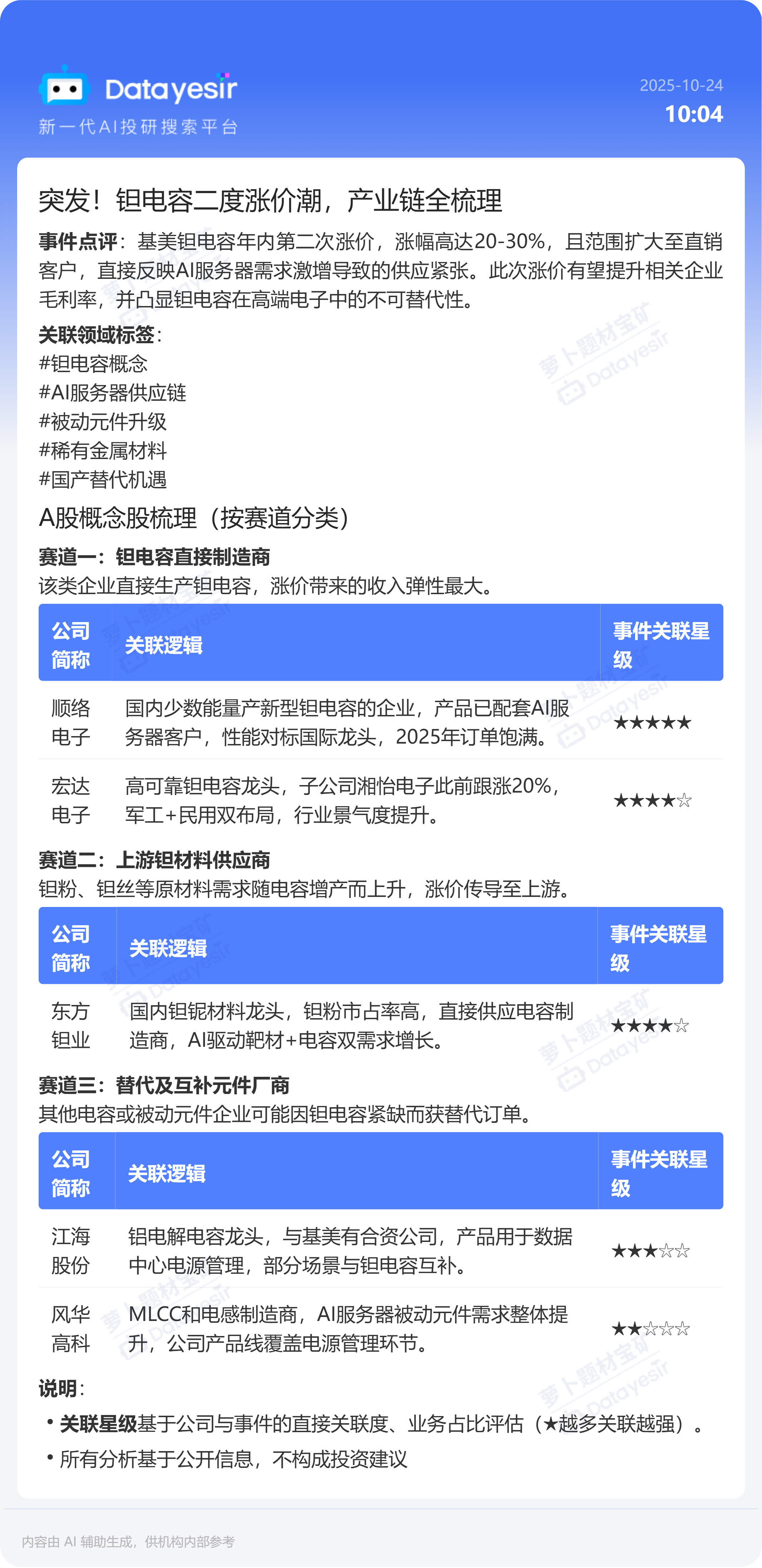 基美钽电容年内第二次涨价,涨幅高达20-30%,且范围扩大至直销客户,直接反映AI服务器需求激增导致的供应紧张。此次涨价有望提升相关企业毛利率,并凸显钽电容在高端电子中的不可替代性。