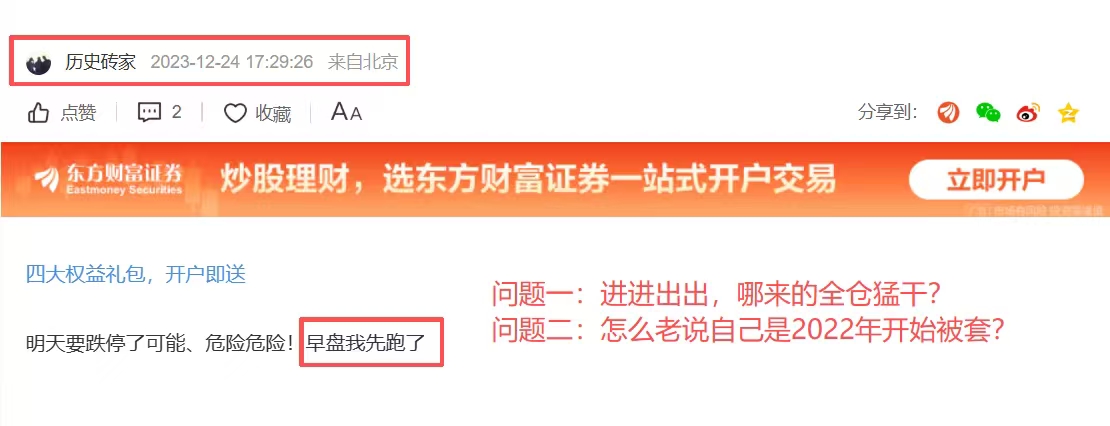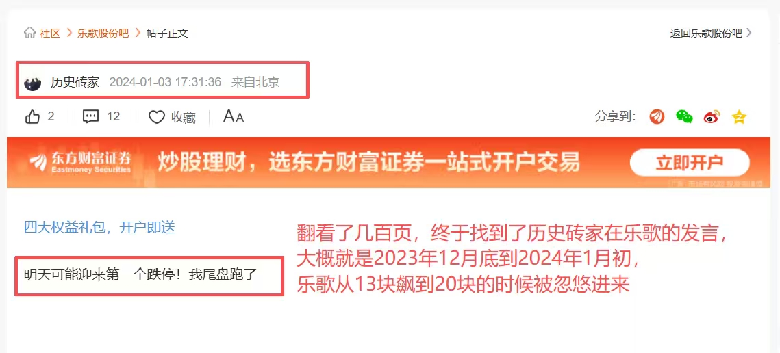 闲来无事,翻了股吧历史记录,大概在2023年12月底首次出现历史砖家的留言记录,