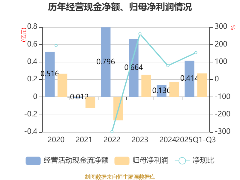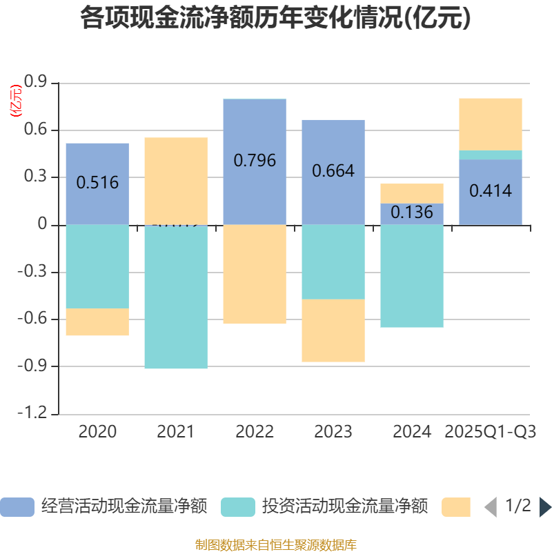 2025年前三季度,公司经营活动现金流净额为4135.86万元,同比增长93.13%;筹资活动现金流净额3292.68万元,同比增加2160.03万元;投资活动现金流净额578.97万元,上年同期为-3366.83万元。