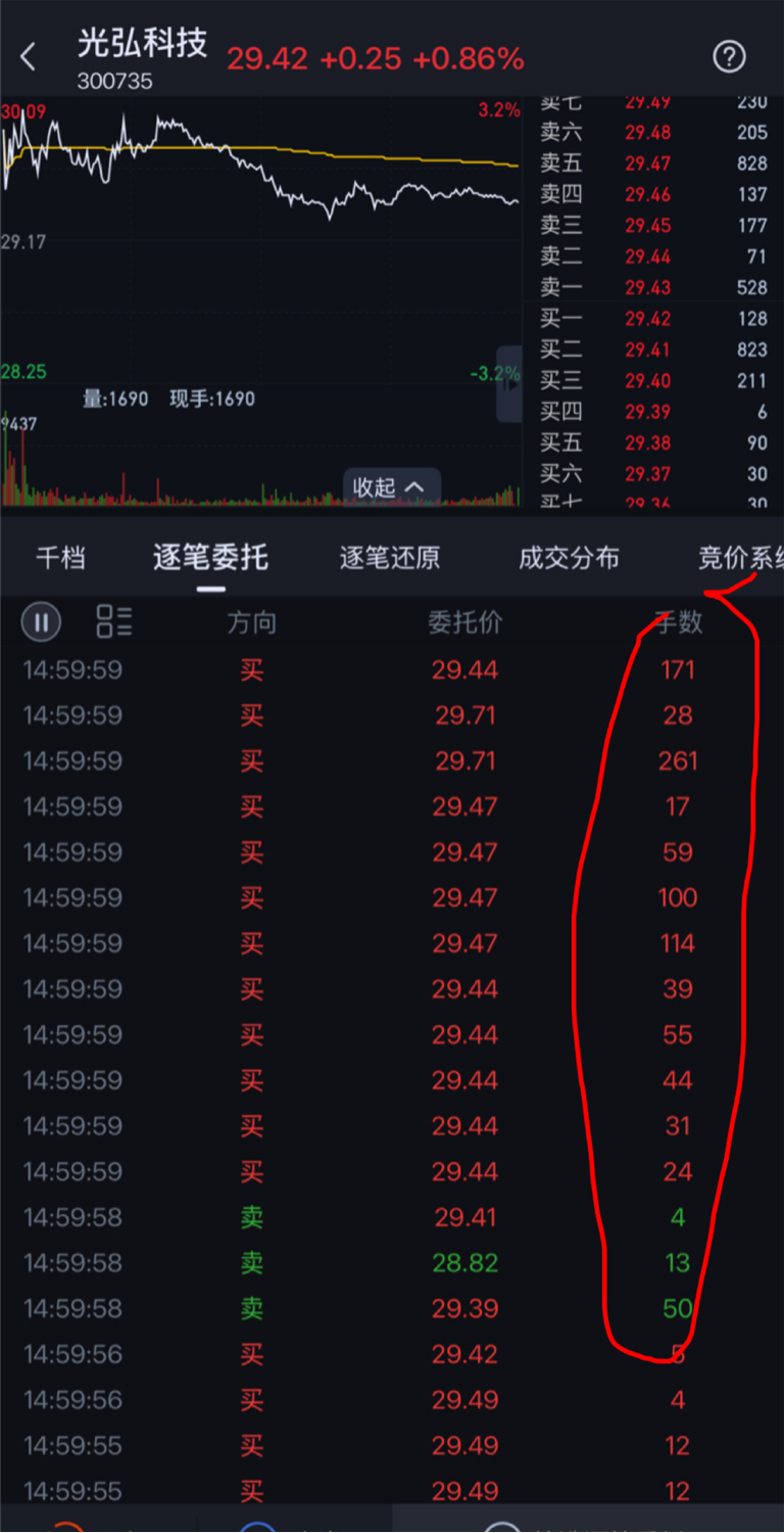 早上开盘集合竞价有资金抢跑(见下图1)!下午收盘前有资金抢筹(见下图2)!