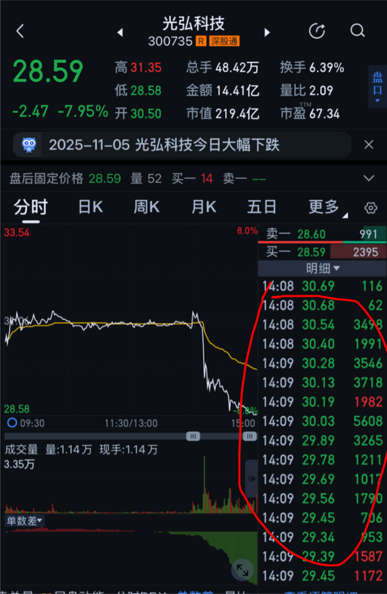Mate 70 air 上热搜!可怜的光弘科技被人为打压!请记住2025年11月5日下午14:08分开始的这些量化大卖单!直接导致破位!
