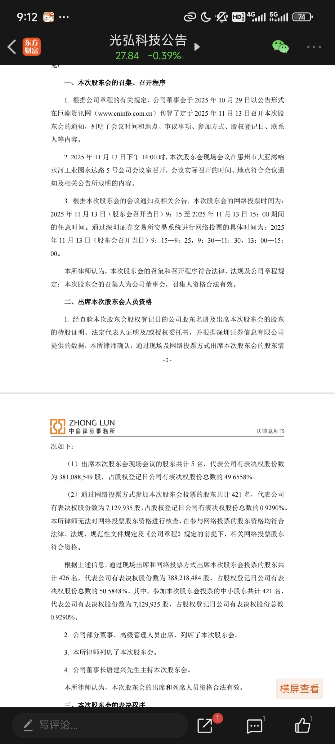 $光弘科技(SZ300735)$ 我感觉大家也没有这么关心这个股票 不然为啥网络投票中小股东只有421人