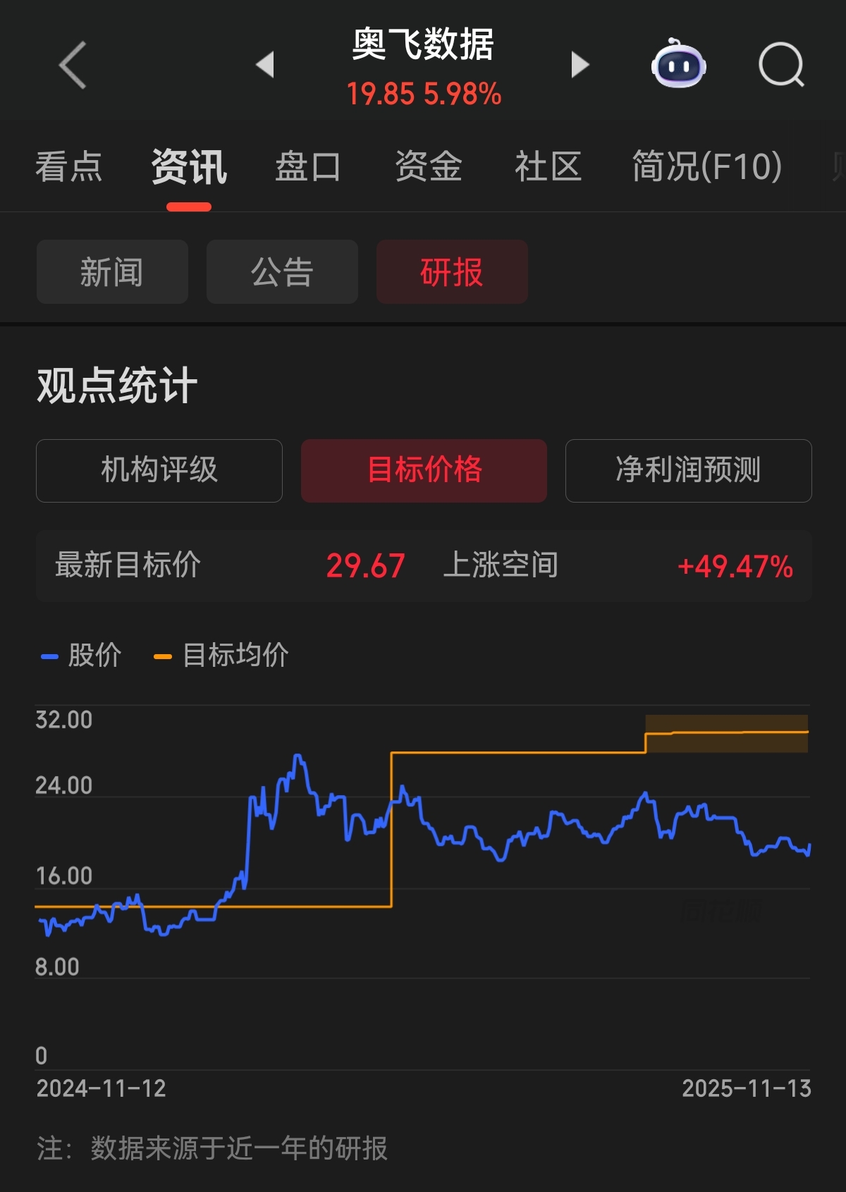 海通国际在10月13日发布的研究报告中,给予奥飞数据“优于大市”评级,并给出29.78元的目标价。按该目标价计算,预期涨幅高达51%。