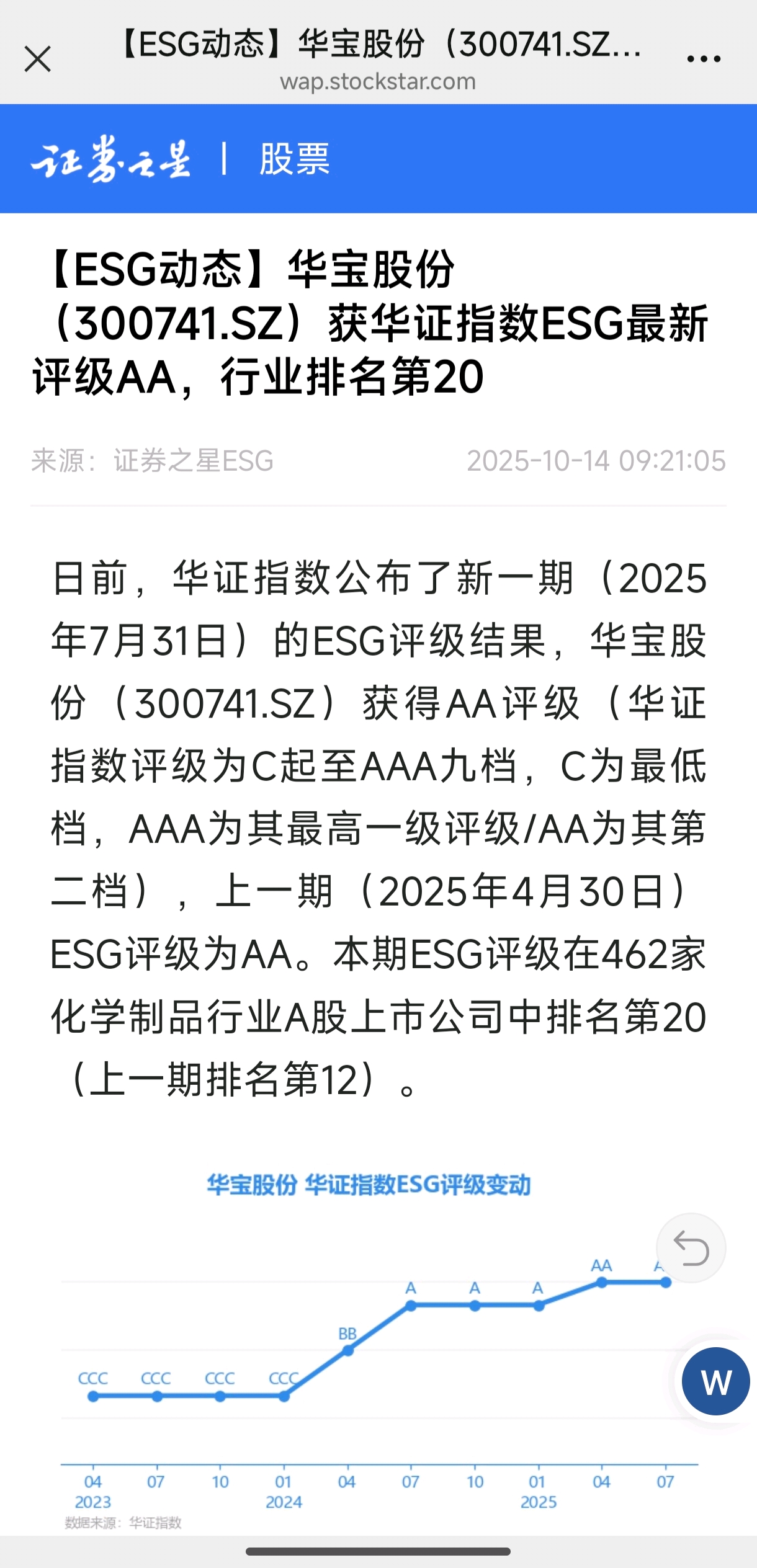 $华宝股份(SZ300741)$ 462家排第20名,可以啊,esg双A,闷声干大事儿