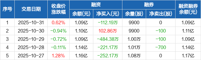 华宝股份:融资净偿还112.19万元,融资余额1.09亿元(10-31)