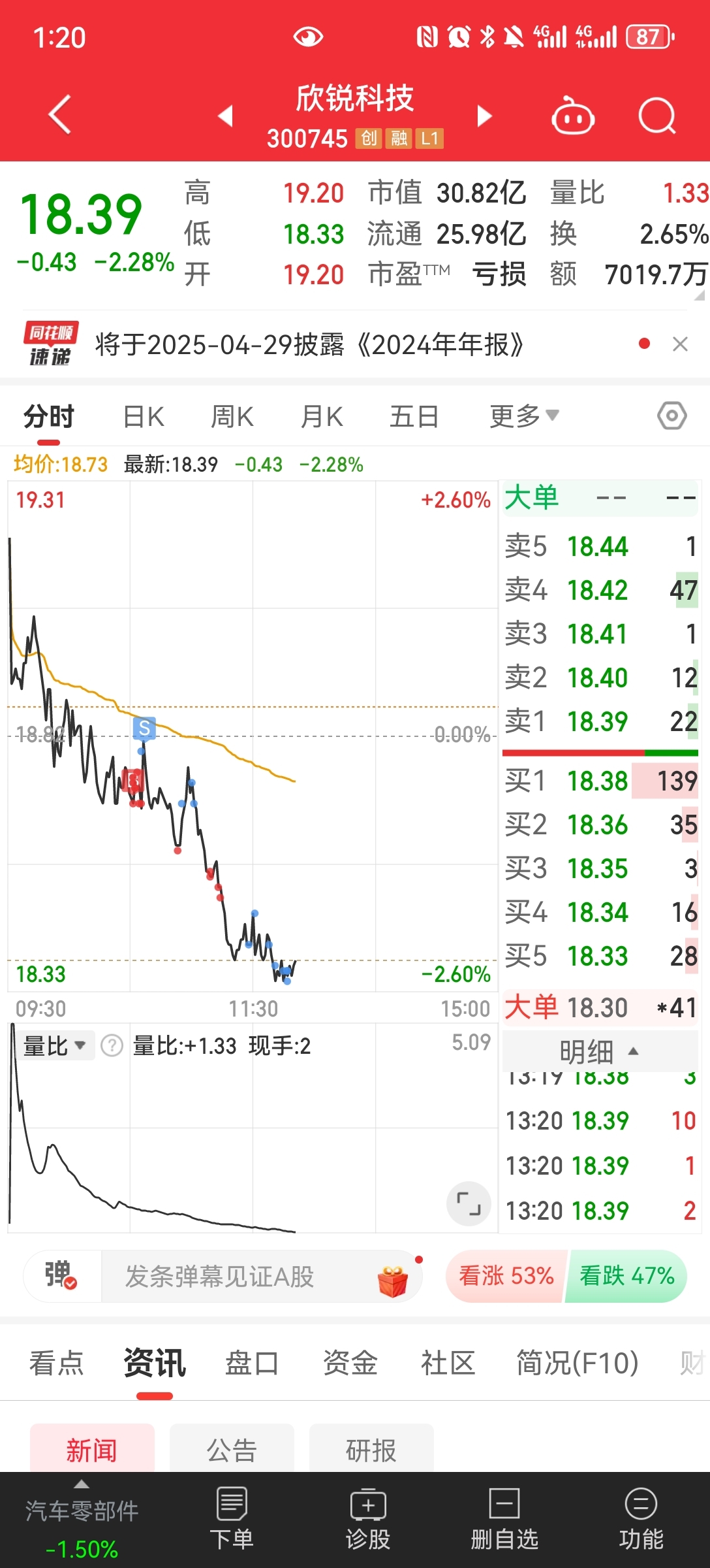 $欣锐科技(SZ300745)$ 上午加了500手,干不动,下午减掉,留底仓,还没有启动迹象