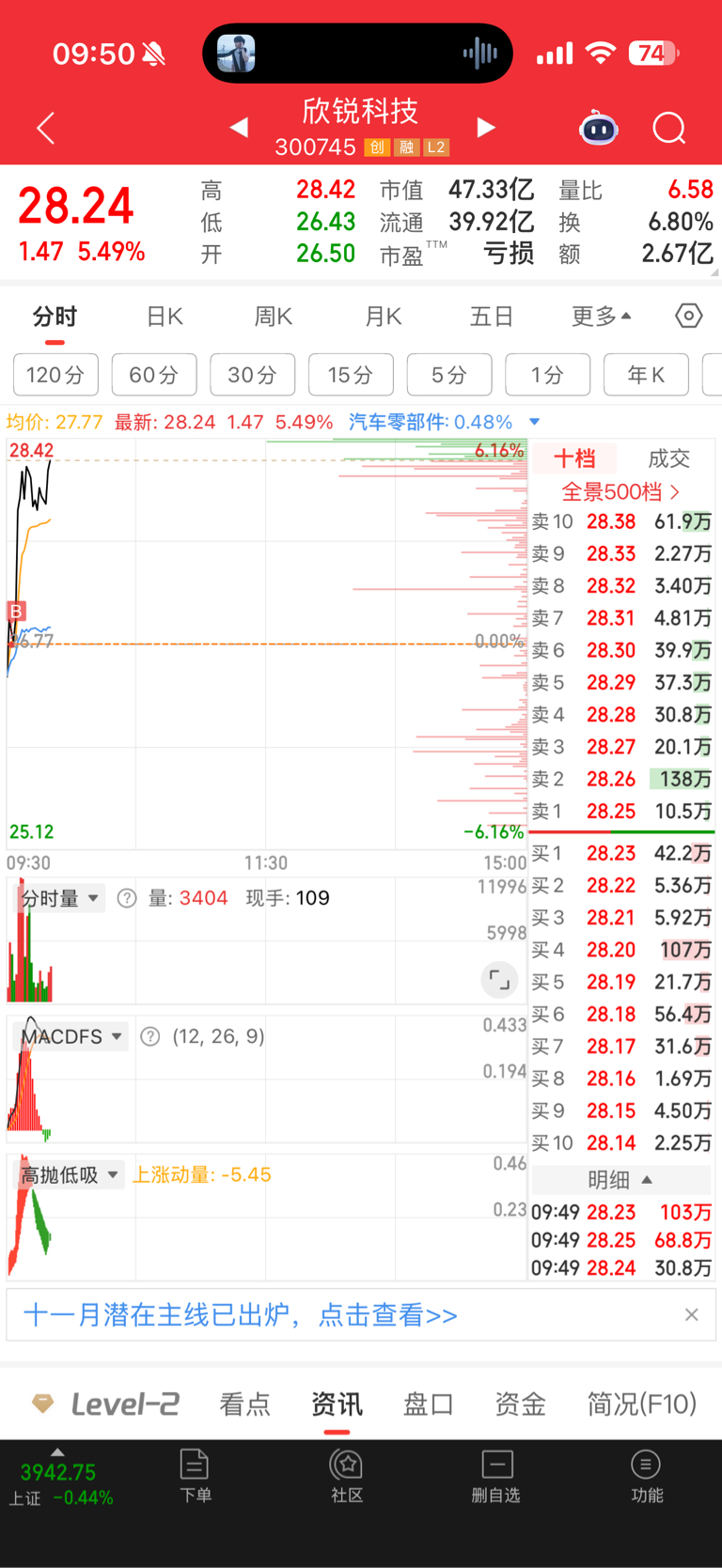 $欣锐科技(SZ300745)$ 昨天不敢买,今天直接杀入,昨天敢买,今天做t就完美了,明天希望有机会做t出来吧