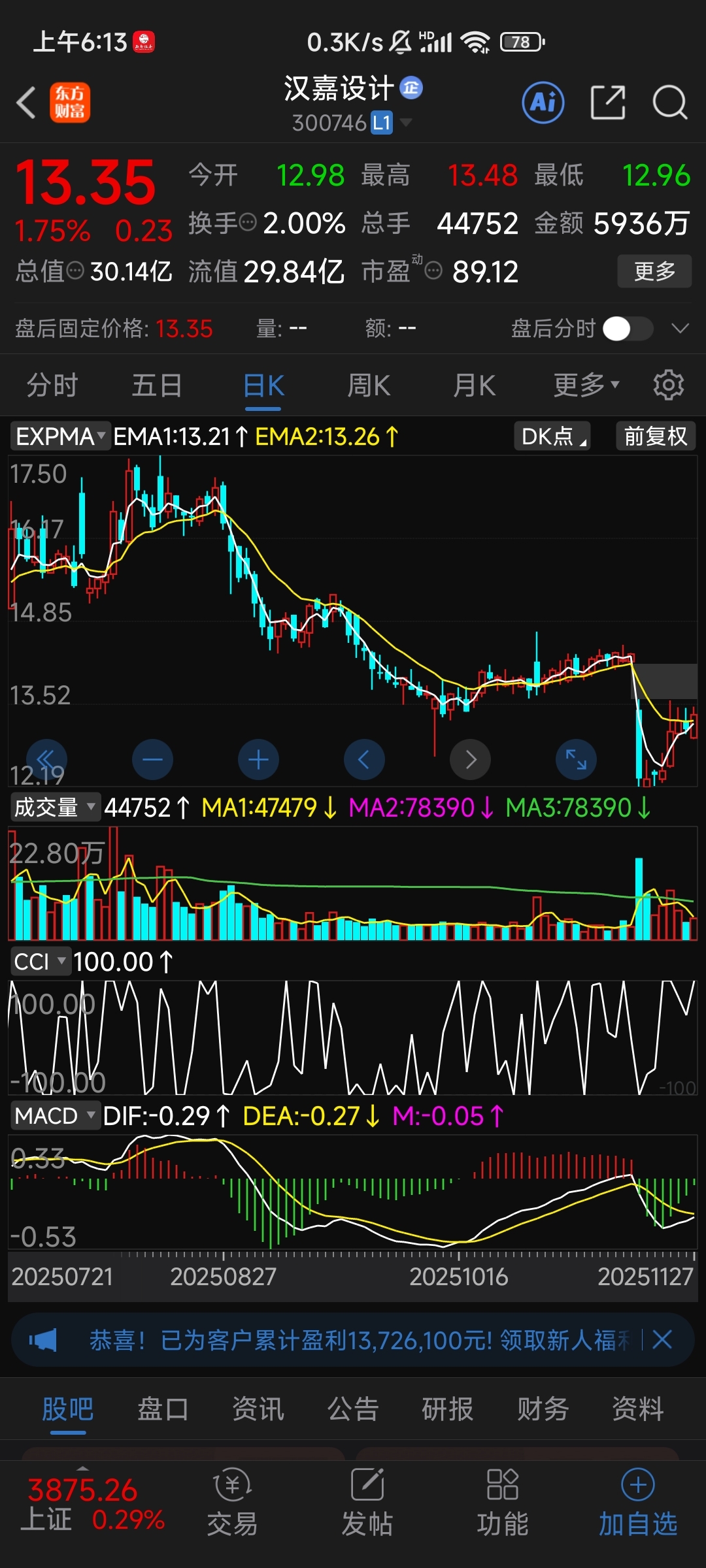 $汉嘉设计(SZ300746)$ 散户要想在主力身上挣钱记住一句话!守住底线,线上买线下卖。
