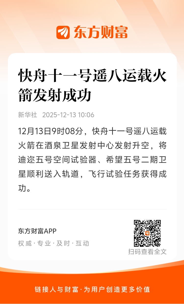12月13日9时08分,快舟十一号遥八运载火箭在酒泉卫星发射中心发射升空,将迪迩五号空间试验器、希望五号二期卫星顺利送入轨道,飞行试验任务获得成功。