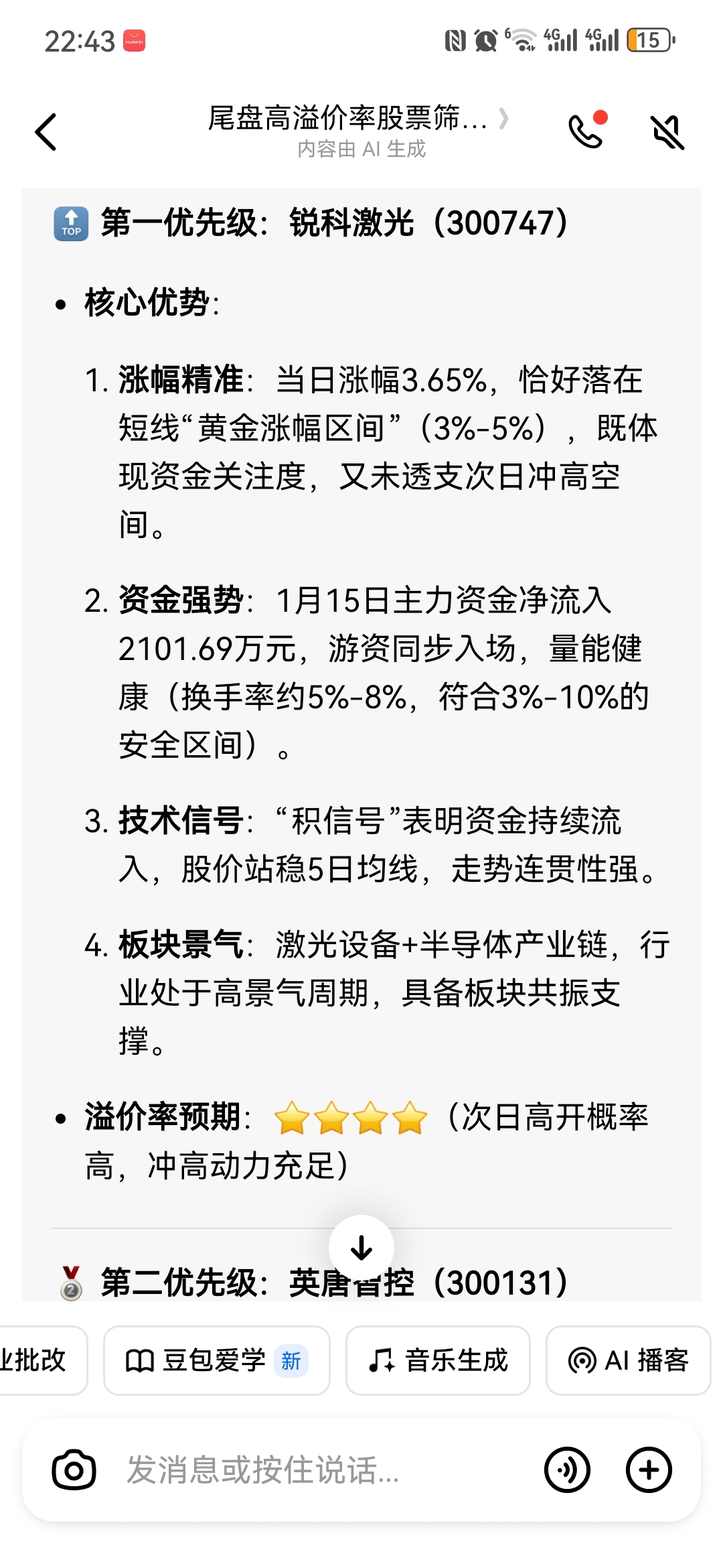 豆包说的,昨天豆包让我买的厦门钨业,今天6个点走的。今天我尾盘进的激光