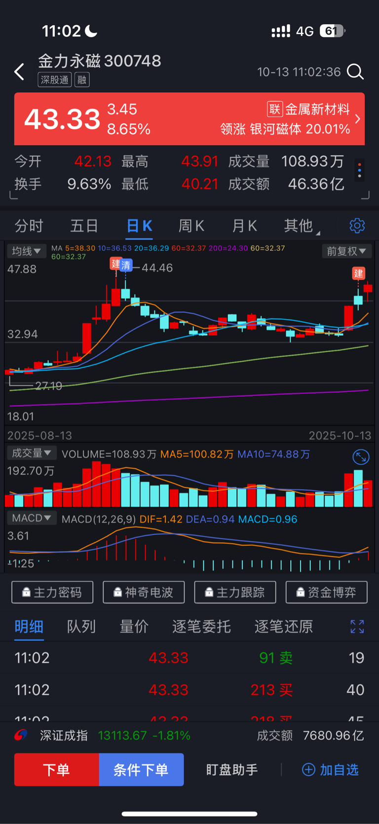 $金力永磁(SZ300748)$ 有点滞涨了,礼拜五进的,先撤了,感谢主力留下的发财