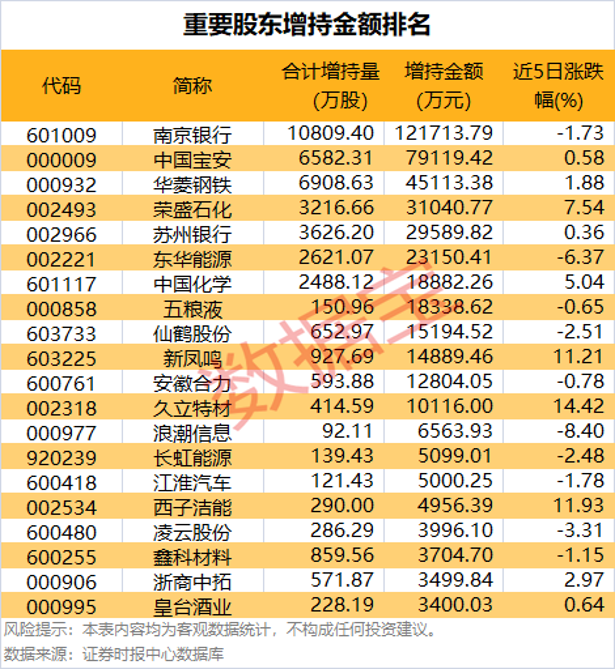 从增持金额看,近5日增持金额在1亿元以上的有12家,增持金额最多的是南京银行,其间累计增持1.08亿股,增持金额合计12.17亿元;其次是中国宝安,增持量为6582.31万股,增持金额7.91亿元;华菱钢铁近5日获股东增持4.51亿元,增持金额位居第三。