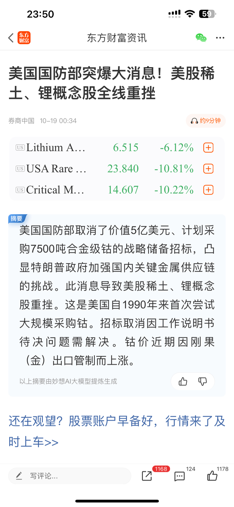 $金力永磁(SZ300748)$ 美国稀土股跌是因为美国国防部取消了订单