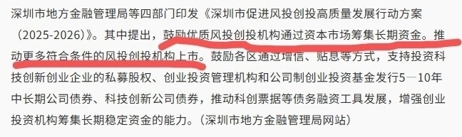 (2025-2026)》。其中提出,鼓励优质风投创投机构通过资本市场筹集长期资金。推动更多符合条件的风投创投机构上市。鼓励各区通过增信、贴息等方式,支持投资科技创新创业企业的私募股权、创业投资管理机构和公司制创业投资基金发行5-10年中长期公司债券、科技创新公司债券,推动科创票据等债务融资工具发展,增强创业投资机构筹集长期稳定资金的能力。(深圳市地方金融管理局网站)