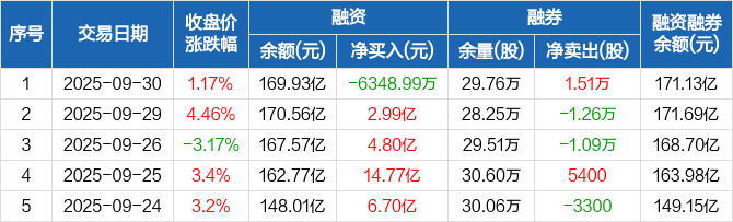 宁德时代:融资净偿还6348.99万元,融资余额169.93亿元(09-30)