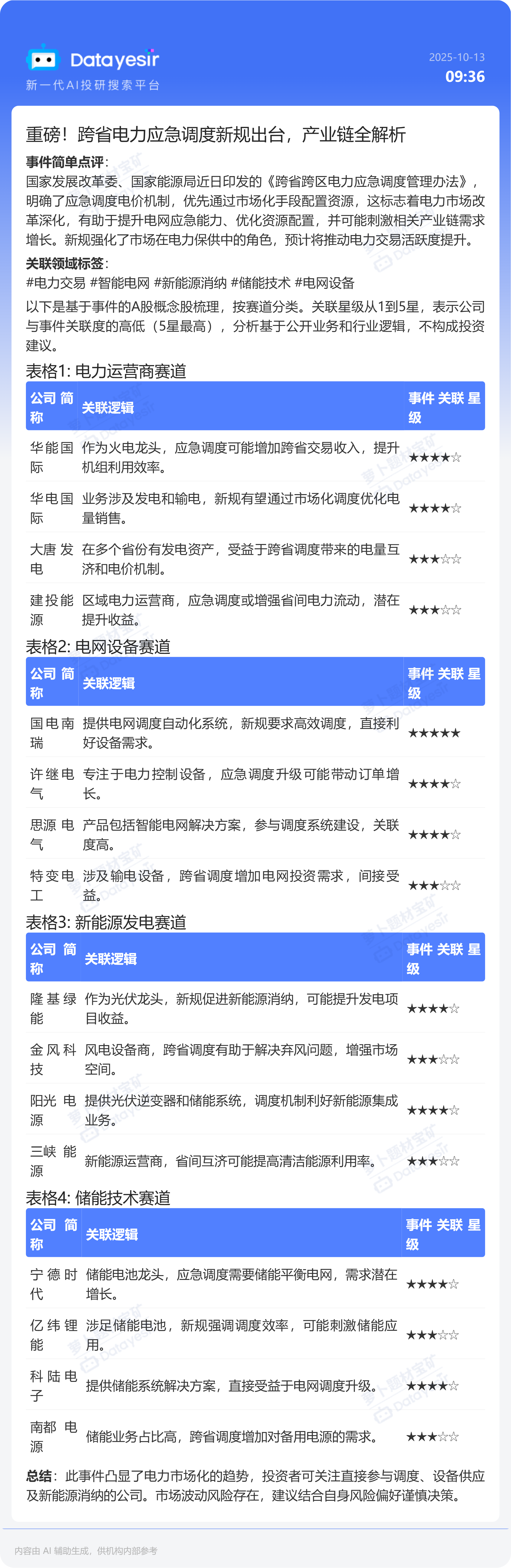 《跨省跨区电力应急调度管理办法》印发,明确了应急调度电价机制,优先通过市场化手段配置资源,这标志着电力市场改革深化,有助于提升电网应急能力、优化资源配置,并可能刺激相关产业链需求增长。
