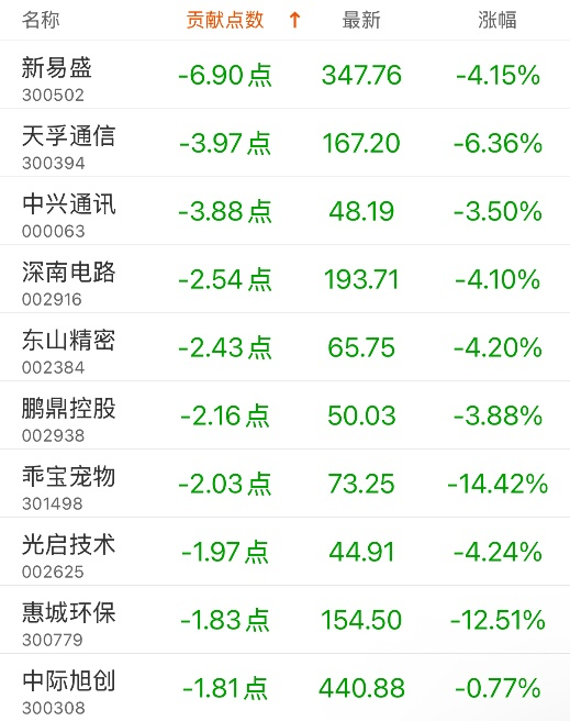 对深证成指贡献点数最多的个股是宁德时代,贡献7.95点,该股当日涨0.96%,收盘价376.45元;拖累点数最多的个股是新易盛,拖累6.90点,该股当日跌4.15%,收盘价347.76元。