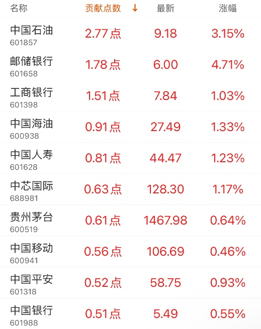 对上证指数贡献点数最多的个股是中国石油,贡献2.77点,该股当日涨3.15%,收盘价9.18元;拖累点数最多的个股是农业银行,拖累1.81点,该股当日跌1.24%,收盘价7.99元。