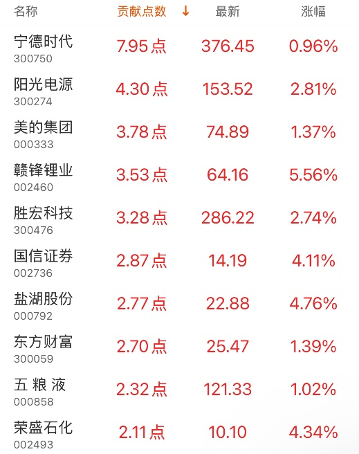 指数贡献榜:宁德时代贡献7.95点