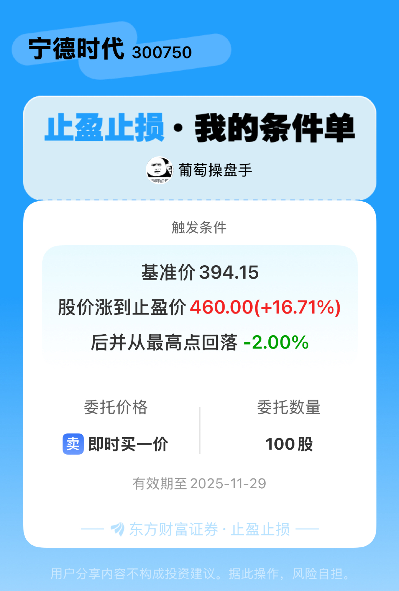 #条件单交流# #止盈止损晒单# 一位股神设置了一个止盈止损条件单,接下来就是见证奇迹的时刻~$宁德时代(SZ300750)$