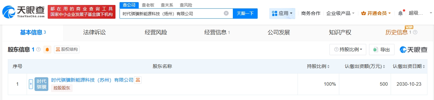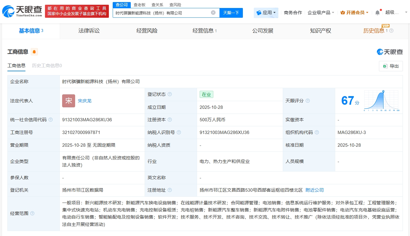 每经AI快讯,天眼查App显示,近日,时代骐骥新能源科技(扬州)有限公司成立,法定代表人为宋庆龙,注册资本500万元人民币,经营范围包括新兴能源技术研发、新能源汽车换电设施销售、合同能源管理、电池销售等。股东信息显示,该公司由宁德时代旗下时代骐骥新能源科技(苏州)有限公司全资持股。