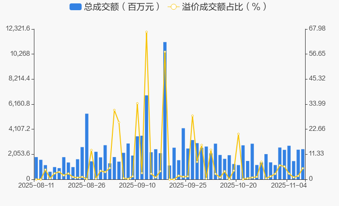 折溢价方面,溢价率最高的个股是北京银行,溢价率为10.23%,成交价为6.25元,成交1笔金额为468.75万元,成交量75万股;折价率最高的个股是一诺威,折价率为31.74%,成交价为11.25元,成交1笔金额为112.5万元,成交量10万股。