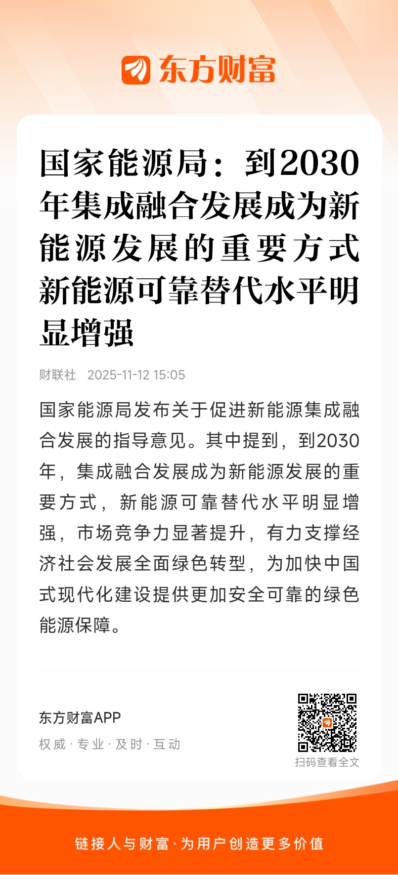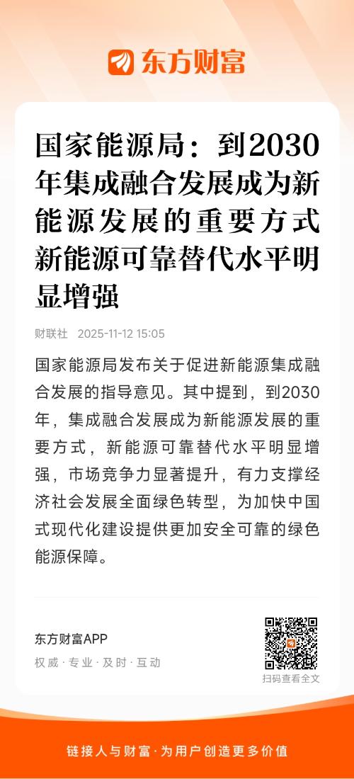 国家能源局发布关于促进新能源集成融合发展的指导意见。其中提到,到2030年,集成融合发展成为新能源发展的重要方式,新能源可靠替代水平明显增强,市场竞争力显著提升,有力支撑经济社会发展全面绿色转型,为加快中国式现代化建设提供更加安全可靠的绿色能源保障。
