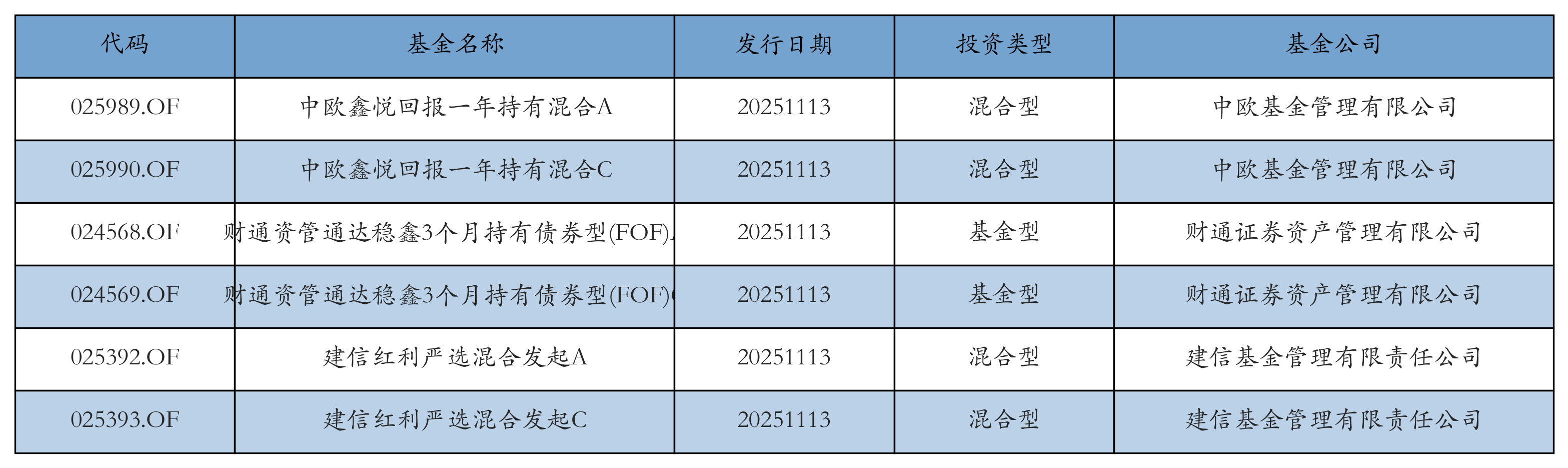 昨日有6只新基金发行,分别为:中欧鑫悦回报一年持有混合A、中欧鑫悦回报一年持有混合C、财通资管通达稳鑫3个月持有债券型(FOF)A、财通资管通达稳鑫3个月持有债券型(FOF)C、建信红利严选混合发起A、建信红利严选混合发起C,详情见下表: