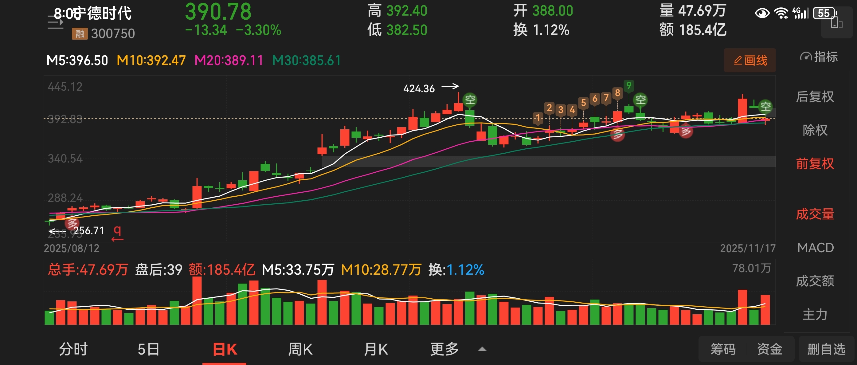 $宁德时代(SZ300750)$ 大盘反弹他反弹,关注二十日线和三十日线!上下五块钱!分享经验不构成投资建议