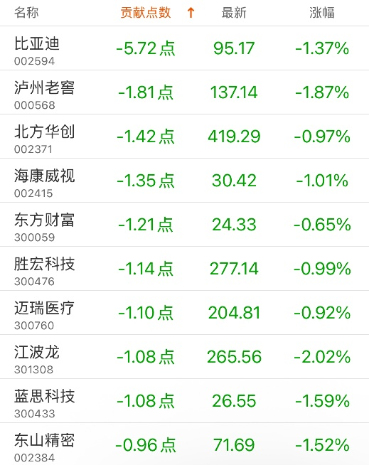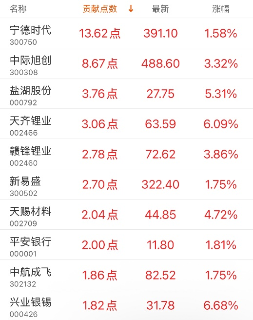 对深证成指贡献点数最多的个股是宁德时代,贡献13.62点,该股当日涨1.58%,收盘价391.1元;拖累点数最多的个股是比亚迪,拖累5.72点,该股当日跌1.37%,收盘价95.17元。