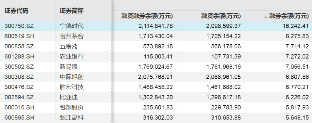 Wind数据显示,截至11月28日,A股市场融券余额居前的股票分别为宁德时代、贵州茅台、五粮液,融券余额分别为1.62亿元、0.83亿元、0.77亿元。