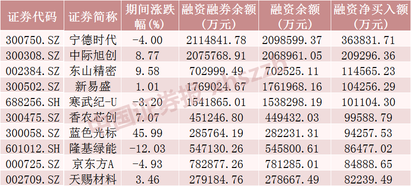 从个股情况来看,11月融资客对237只股票加仓金额超1亿元,加仓金额居前的10只股票分别为宁德时代、中际旭创、东山精密、新易盛、寒武纪-U、香农芯创、蓝色光标、隆基绿能、京东方A、天赐材料,分别净买入36.38亿元、20.93亿元、11.46亿元、10.43亿元、10.11亿元、9.96亿元、9.43亿元、8.65亿元、8.49亿元、8.22亿元。从市场表现上看,11月融资客加仓金额居前十的股票涨多跌少,涨幅最大的蓝色光标涨幅近46%。