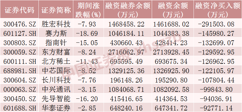 11月融资客对269只股票减仓金额超1亿元,减仓金额居前的10只股票分别为胜宏科技、赛力斯、指南针、东方财富、北方稀土、中芯国际、长川科技、中兴通讯、先导智能、华泰证券,分别净卖出29.15亿元、14.60亿元、13.27亿元、12.96亿元、12.70亿元、12.21亿元、10.78亿元、9.98亿元、9.40亿元、9.28亿元。从市场表现上来看,这10只股票11月均下跌。