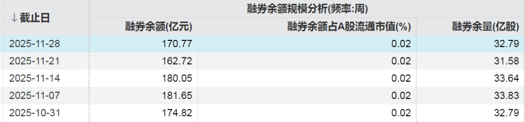 Wind数据显示,截至11月28日,A股市场融券余额为170.77亿元,11月融券余额减少4.05亿元,融券余量为32.79亿股。