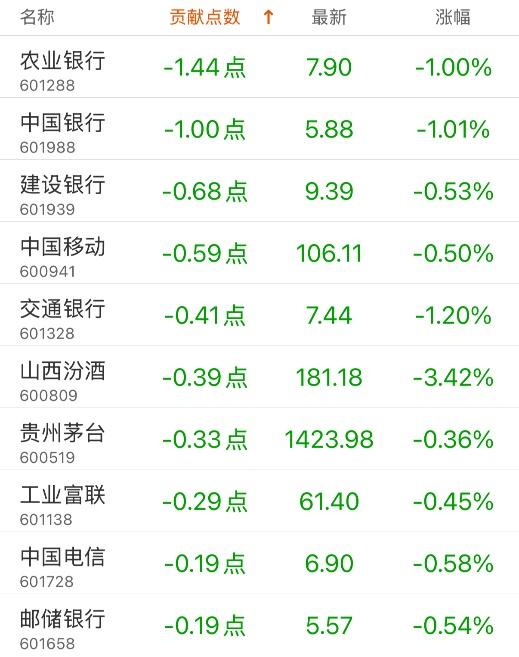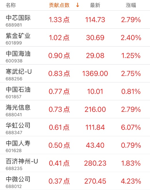 对上证指数贡献点数最多的个股是中芯国际,贡献1.33点,该股当日涨2.79%,收盘价114.73元;拖累点数最多的个股是农业银行,拖累1.44点,该股当日跌1.00%,收盘价7.9元。