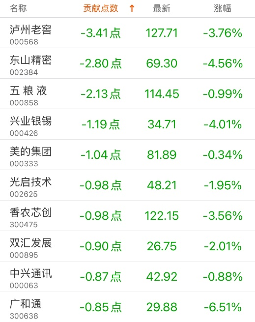 对深证成指贡献点数最多的个股是宁德时代,贡献16.34点,该股当日涨1.93%,收盘价383.35元;拖累点数最多的个股是泸州老窖,拖累3.41点,该股当日跌3.76%,收盘价127.71元。