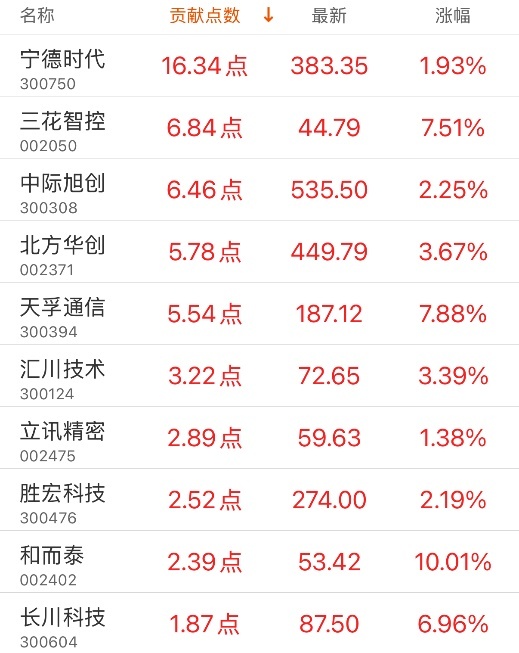 指数贡献榜:宁德时代贡献16.34点