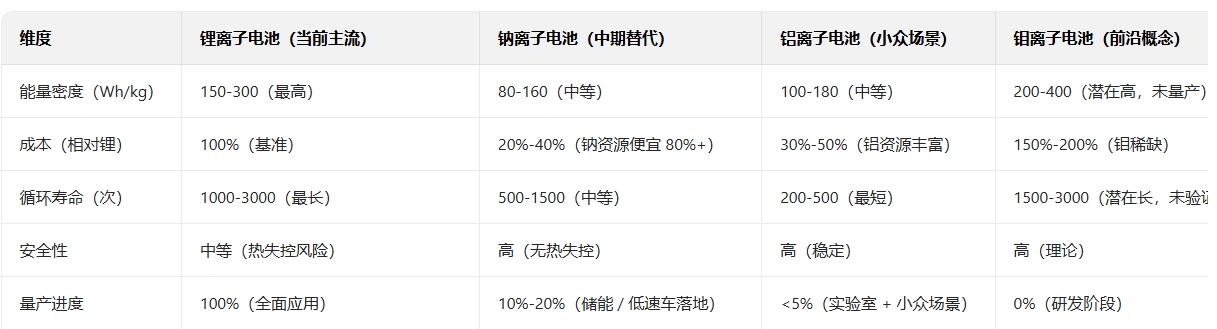 $宁德时代(SZ300750)$ 看铝和钼还在PPT阶段,感觉钼搭载更远。从安全性,成本,寿命,量产落地,钠全面碾压铝,不过钠的公里数寿命比锂差。锂是主流,钠小场景,钼高精尖,铝纯扯淡。
