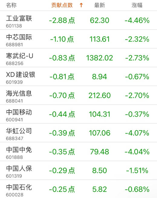 对上证指数贡献点数最多的个股是农业银行,贡献2.04点,该股当日涨1.41%,收盘价7.93元;拖累点数最多的个股是工业富联,拖累2.88点,该股当日跌4.46%,收盘价62.3元。