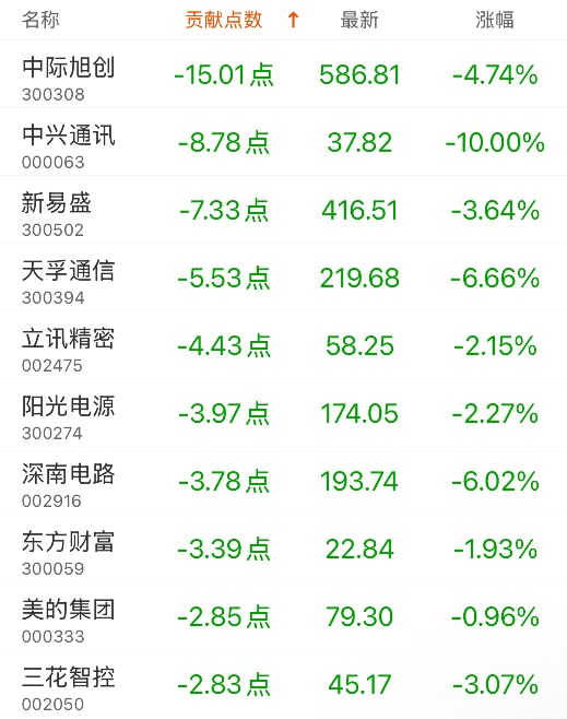 对深证成指贡献点数最多的个股是宁德时代,贡献14.91点,该股当日涨1.73%,收盘价388.99元;拖累点数最多的个股是中际旭创,拖累15.01点,该股当日跌4.74%,收盘价586.81元。