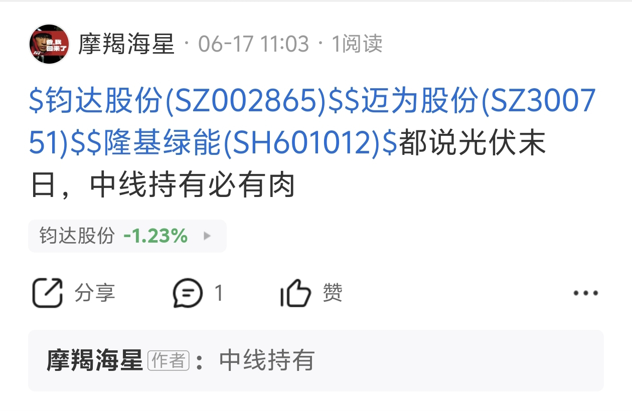 $迈为股份(SZ300751)$ 翻了翻之前的帖子,6月17日发光伏抄底,第二天开始往上,现在迈为都翻倍了 $隆基绿能(SH601012)$ $钧达股份(SZ002865)$