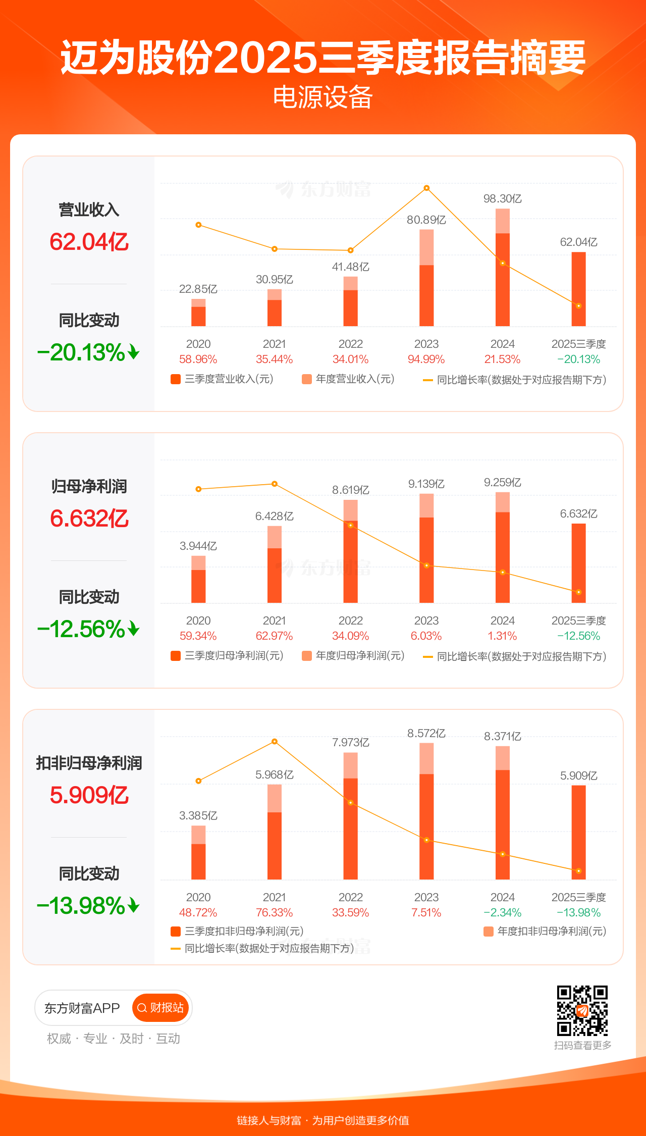 迈为股份10月29日发布2025年三季报显示,公司前三季实现营业收入62.04亿元,同比下滑20.13%;归母净利润6.63亿元,同比下滑12.56%;扣非归母净利润5.91亿元,同比下滑13.98%。