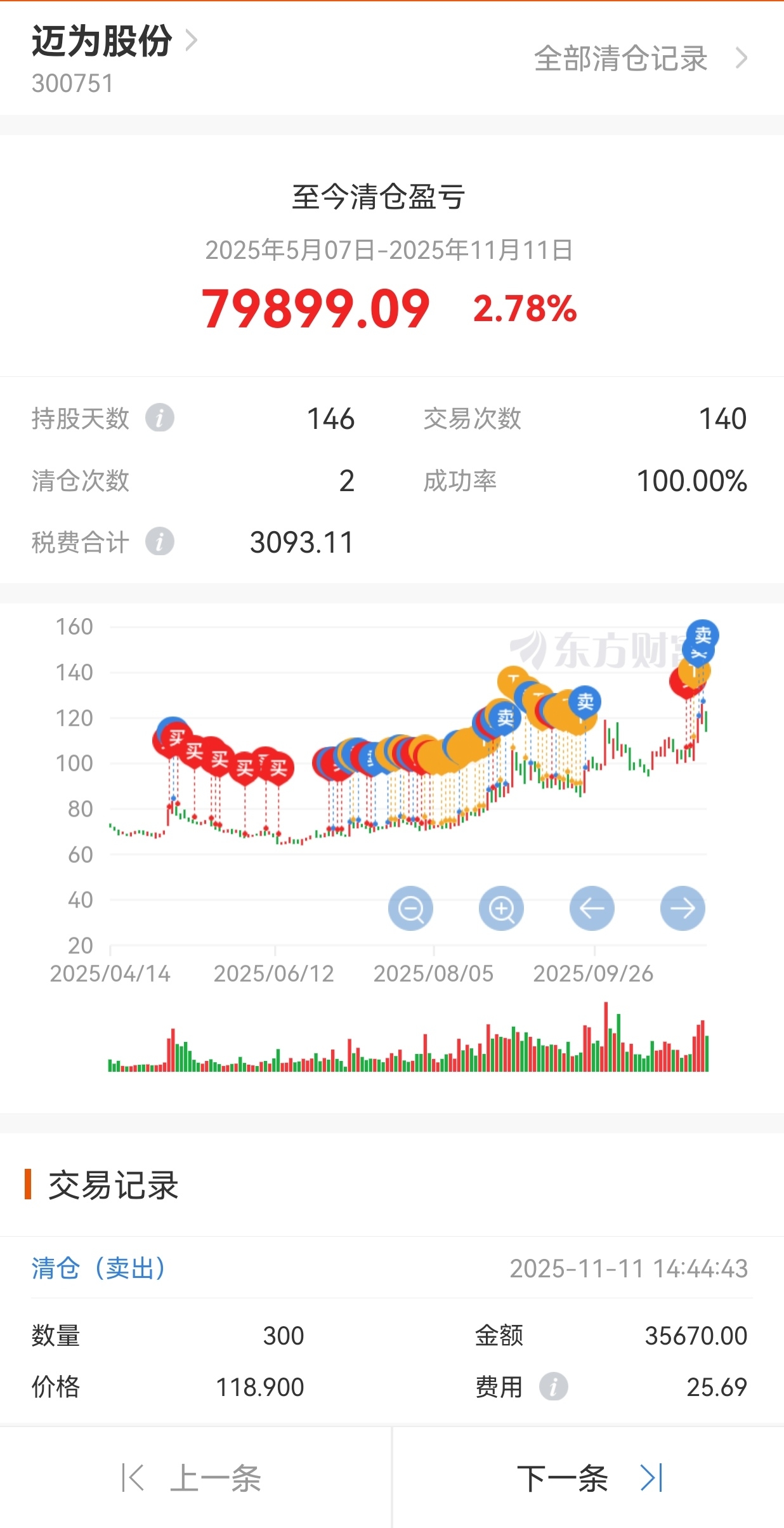 $迈为股份(SZ300751)$ 太感谢迈为了,靠他回了本,还有富余,之前卖了新易盛,买了它,本想着能上120,结果掉头向下走了,新易盛涨个不停他跌个不停,不过最后总算熬过苦日子看见希望了。