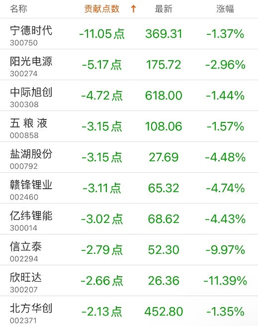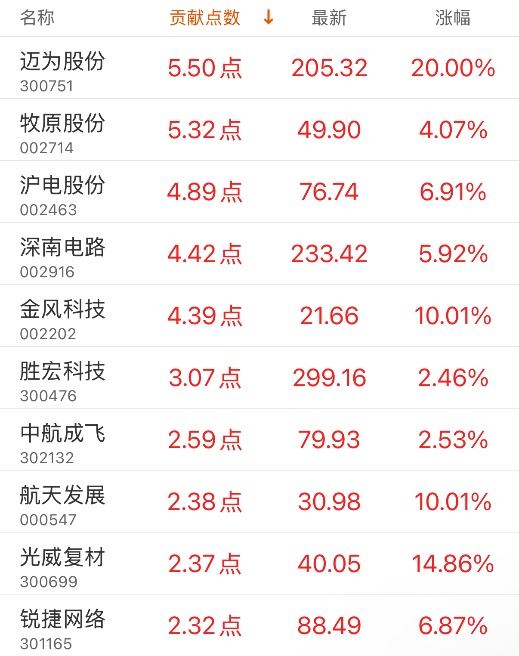 对深证成指贡献点数最多的个股是迈为股份,贡献5.50点,该股当日涨20%,收盘价205.32元;拖累点数最多的个股是宁德时代,拖累11.05点,该股当日跌1.37%,收盘价369.31元。