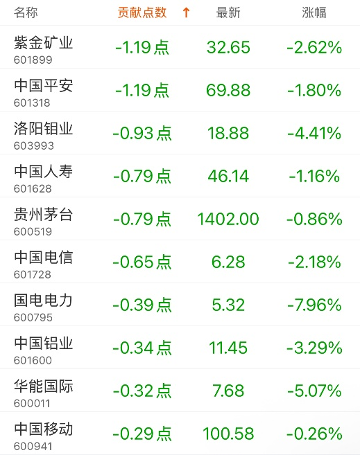 对上证指数贡献点数最多的个股是建设银行,贡献2.51点,该股当日涨1.98%,收盘价9.27元;拖累点数最多的个股是紫金矿业,拖累1.19点,该股当日跌2.62%,收盘价32.65元。