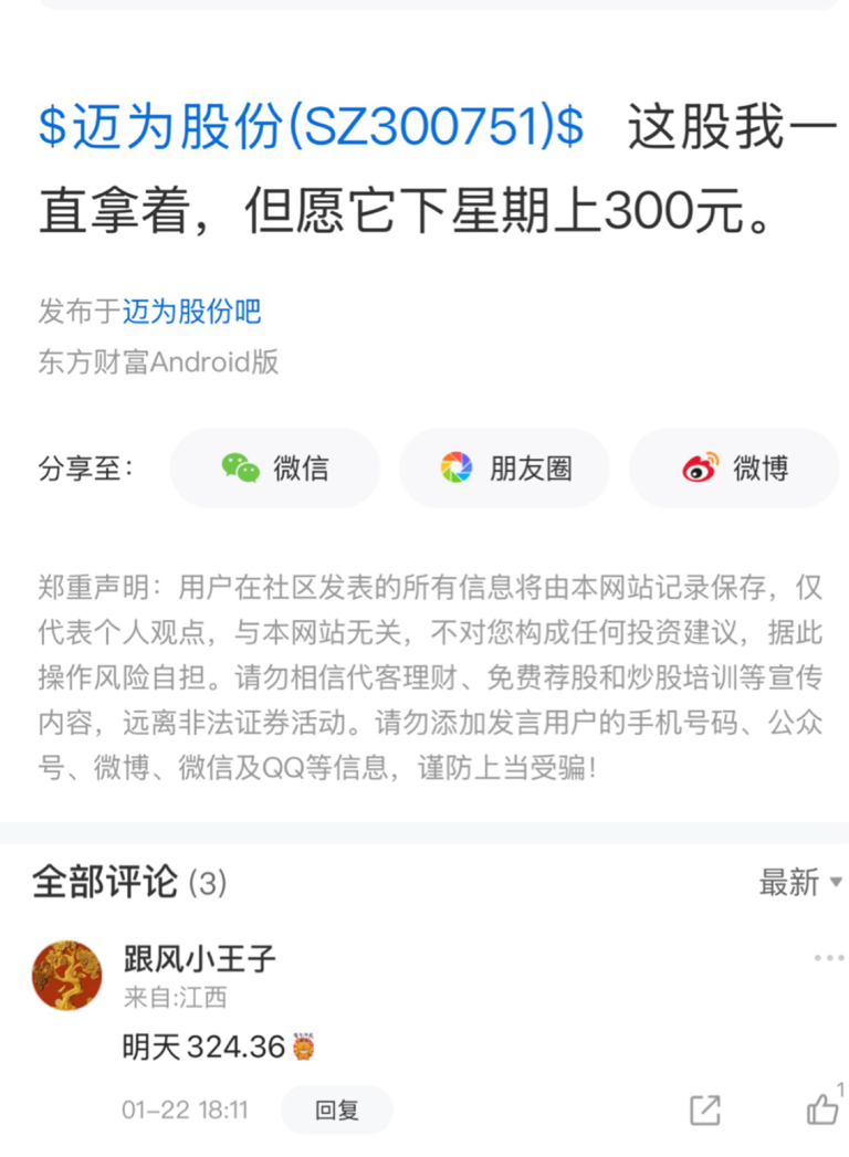 温馨提示: 1.根据《证券法》规定,禁止编造、传播虚假信息或者误导性信息,扰乱证券市场;2.用户在本社区发表的所有资料、言论等仅代表个人观点,与本网站立场无关,不对您构成任何投资建议。用户应基于自己的独立判断,自行决定证券投资并承担相应风险。《东方财富社区管理规定》